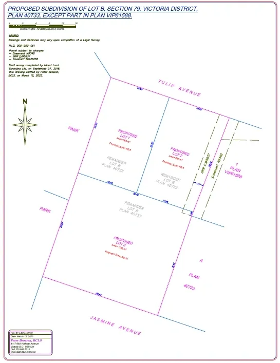 An updated 3-lot proposal has now been submitted to Saanich staff for review and processing. The land is currently zoned RS-18 and we are proposing 2 new, RS-6 lots to be accessed off Tulip Avenue with associated road and trail improvements. The existing home will remain on a new RS-10 lot with access off Jasmine Avenue.
